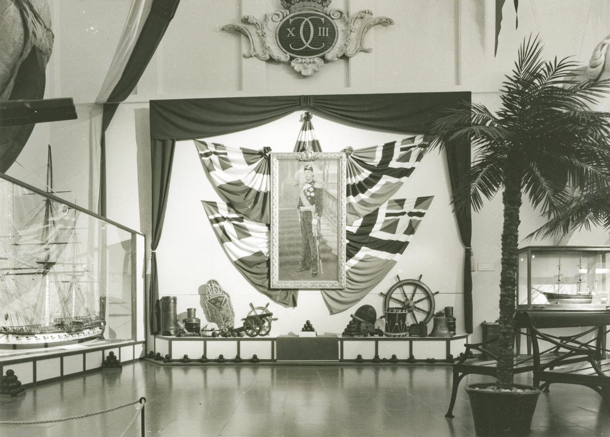 Utställningen "Flottans paviljong". Överblicksbild av utställningen i minneshallen.