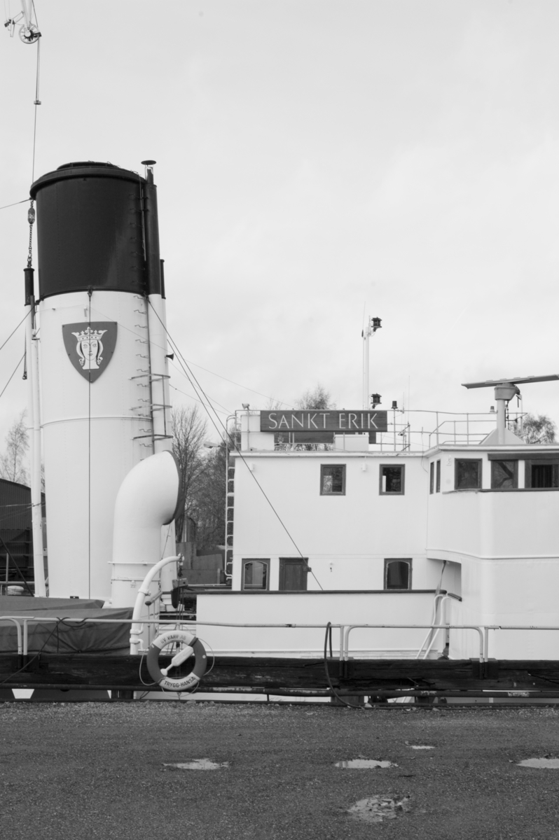 Isbrytaren Sankt Erik vid dockan på Beckholmen för underhållsarbete, november 2005. I bild kommandobrygga och skorsten.