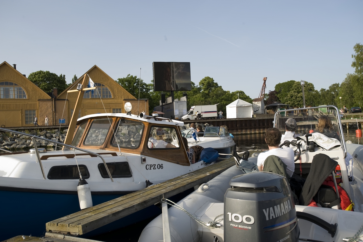 Titel: Tre seklers flaggskepp, maj 2008. Båt in bio i Wasahamnen, visar "Pirates of the Carribean"