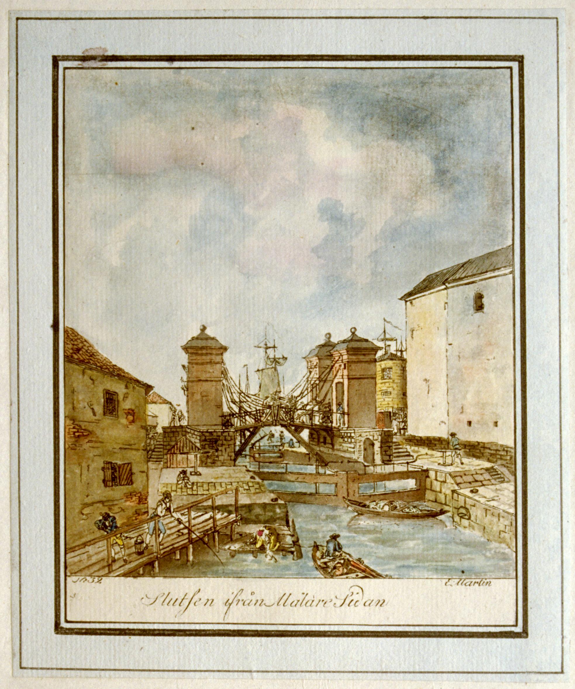 Utsikt mot Slussen, från Mälaren. Akvarellerad konturetsning av Martin Rudolf Heland efter Elias Martin. Från ca 1800.