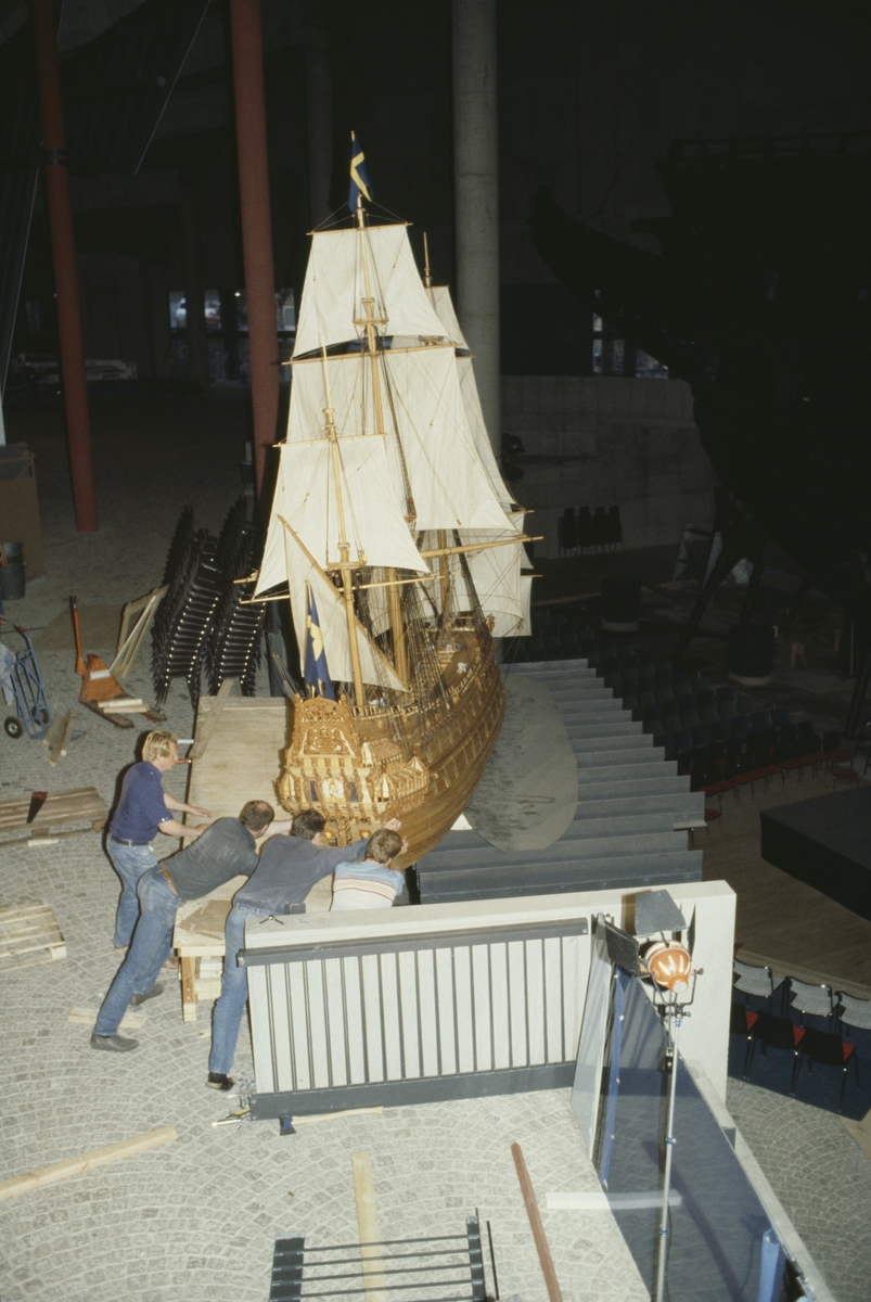 Modellen av Vasa i skala 1:10 justeras på plats i Vasamuseet. Frv Lars Thorhagen, Carl-Gunnar Olsson, Ingvar Jörpeland och Stefan Bruhn.