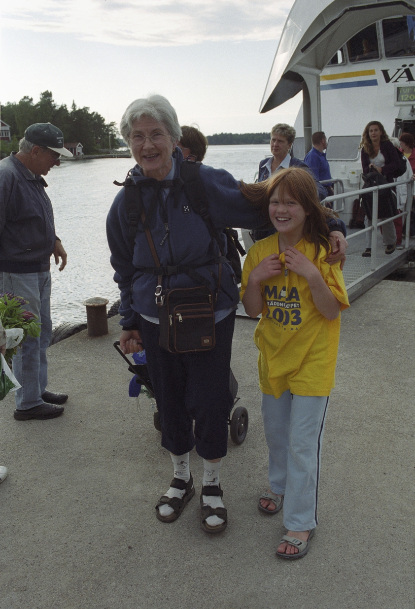 Ulla Salomonsson mottas av barnbarnet Stina Andersson, Ingmarsö