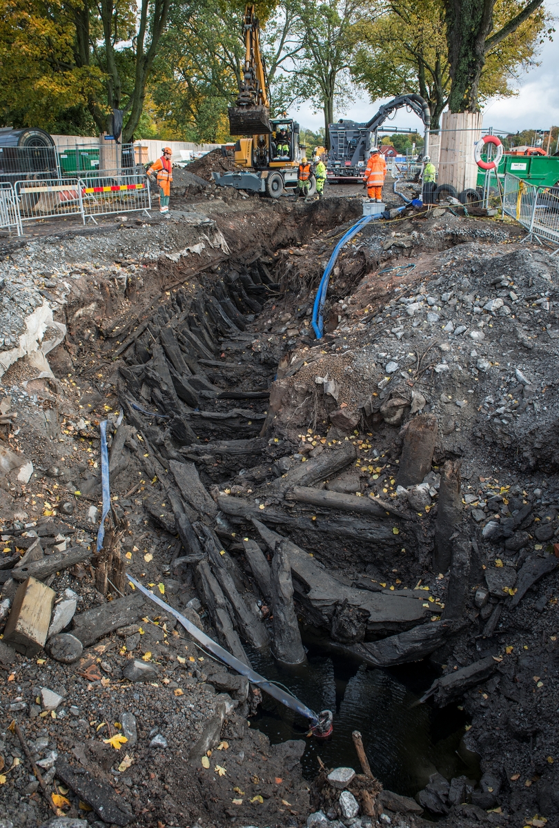 Titel: Vrak hittat sommaren 2017 under kajrenovering på Skeppsholmen, Stockholm. Har identifierats som Gustav II Adolfs flaggskepp Scepter (Spiran), sjösatt 1615. Skeppet deltog i flera sjötåg under kungens eget befäl innan det kasserades och återanvändes som utfyllnad vid anläggningar på Skeppsholmen år 1639.