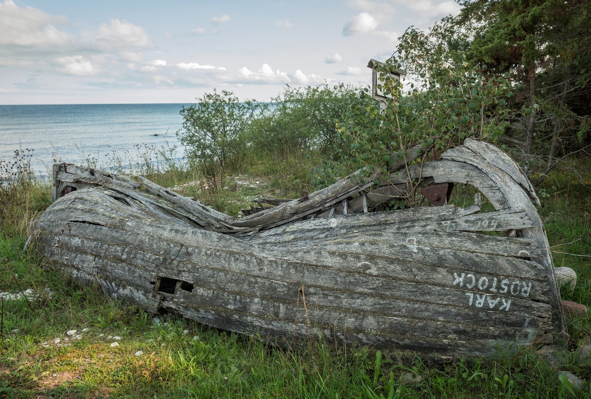 Båtvrak på stranden i Vikstadar som kan ha varit en livbåt som flutit i land 1944. I lokal hörsägen har båten antagits vara en baltisk flyktbåt.