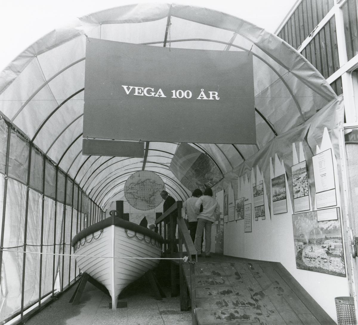 Utställningen "Vega 100 år en krönika om nordostpassagens besegrare". Tillfällig utställning i tält på Djurgården i Stockholm. Inledningen samt livbåt från expeditionen.