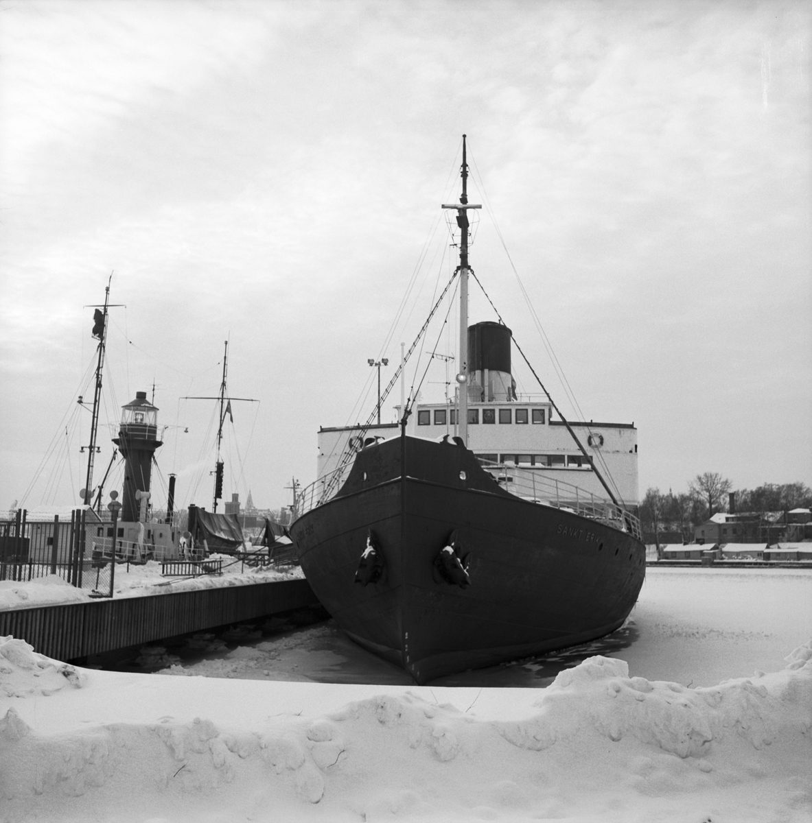 Isbrytaren Sankt Erik vid isbrytarpiren på Galärvarvet på Djurgården år 1987. I bakgrunden fyrskeppet tillika museifartyget Finngrundet.