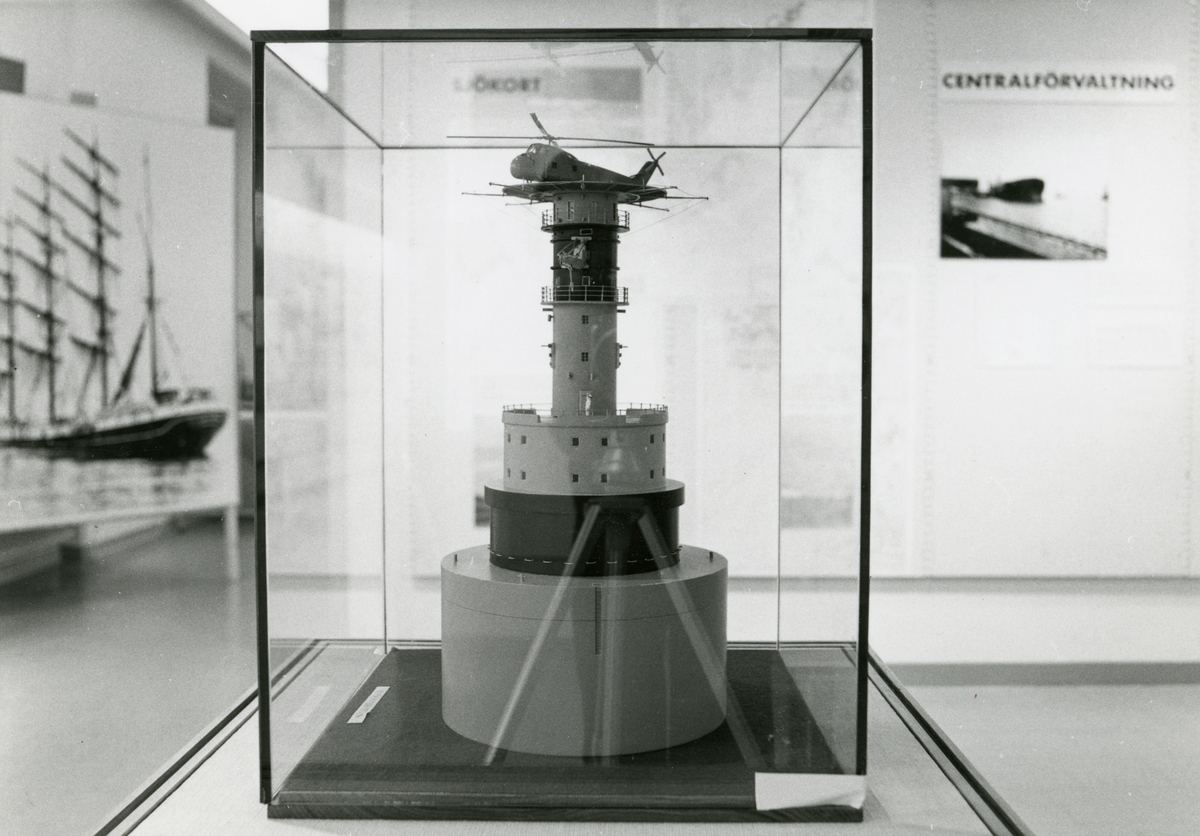 Utställningen "Lotsa, Leda, Loda". En serie teckningar kring Sjöfartsverkets verksamhet i Stockholm sommaren 1974 tecknade av Bertil Kumlien. Utställningsinteriör med en fyrmodell.