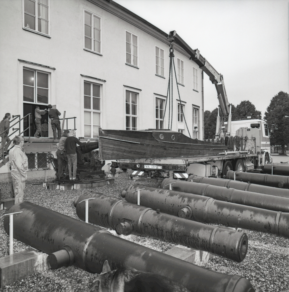 Utställningen "Smuggling". Museets personal arbetar med installering av båt genom museets fönster inför utställningen om smuggling.