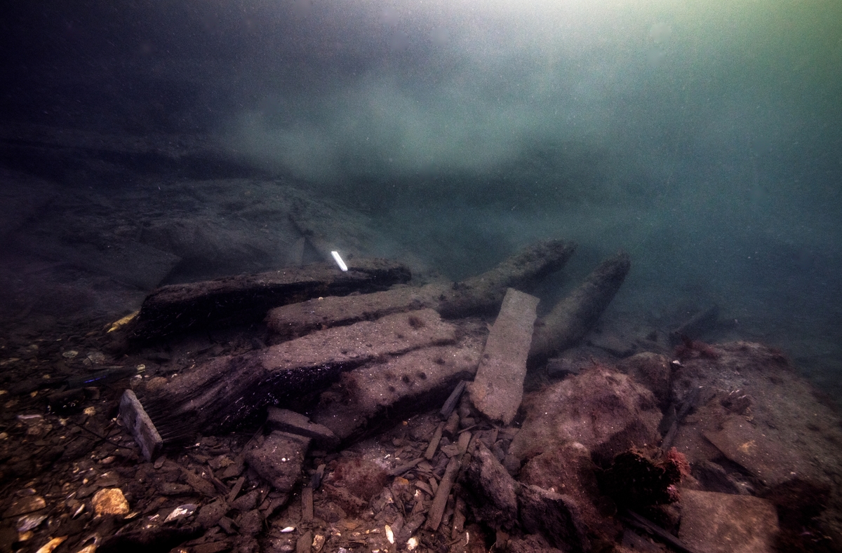 Spant, bottenstockar och bordläggning vid ID3. Detta är det enda synliga sammanhängande skrovpartiet.