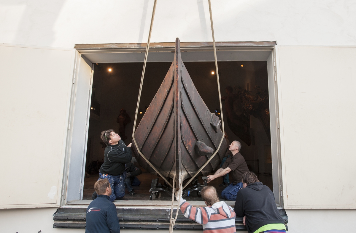 Vikingabåt TÄLJA lyfts in i Minneshallen på Sjöhistoriska inför höstlovet 2013