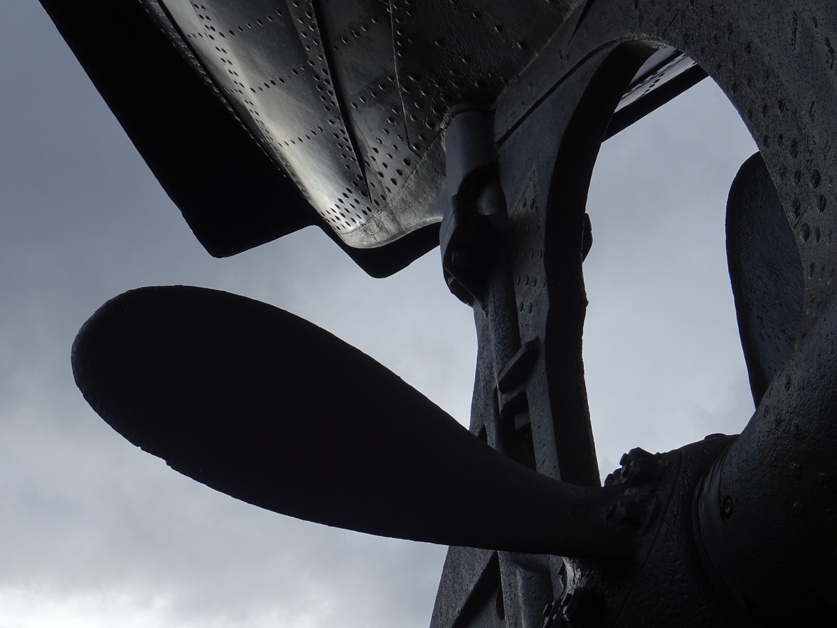 Isbrytaren SANKT ERIK på Stockholms Reparationsvarv. Silhuett av roder och propeller.