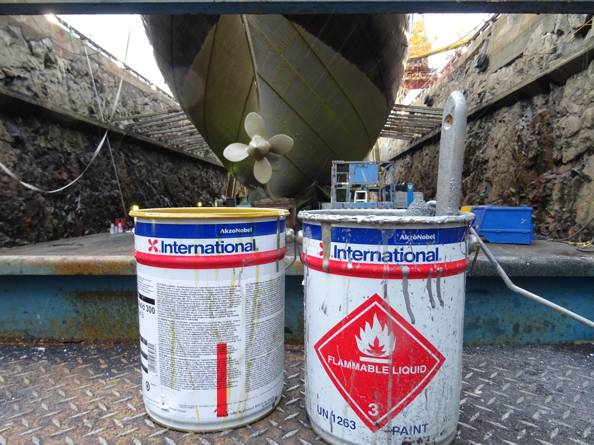 Isbrytaren SANKT ERIK på Stockholms Reparationsvarv. Färgtunnor i förgrunden.