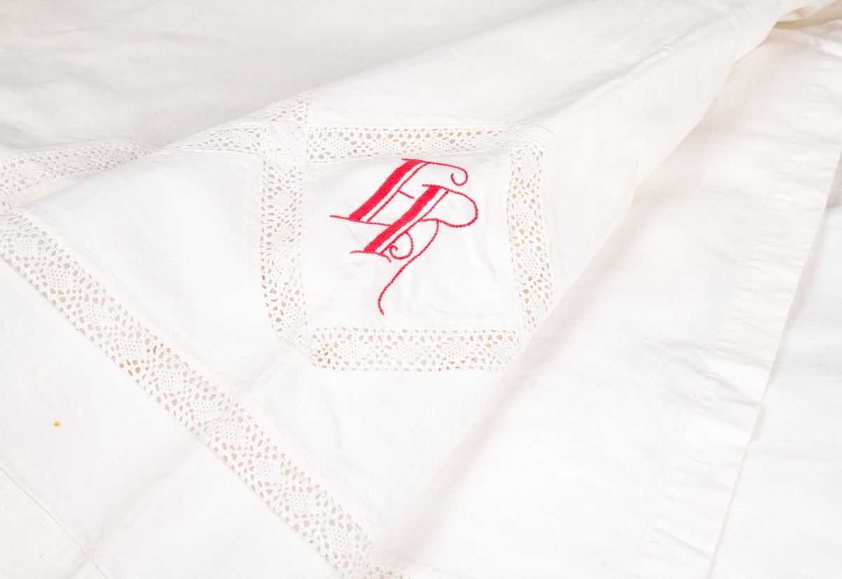 Lakan broderat med initialerna E.R. Togs med på flykt från Nargö, Estland till Sverige år 1943.