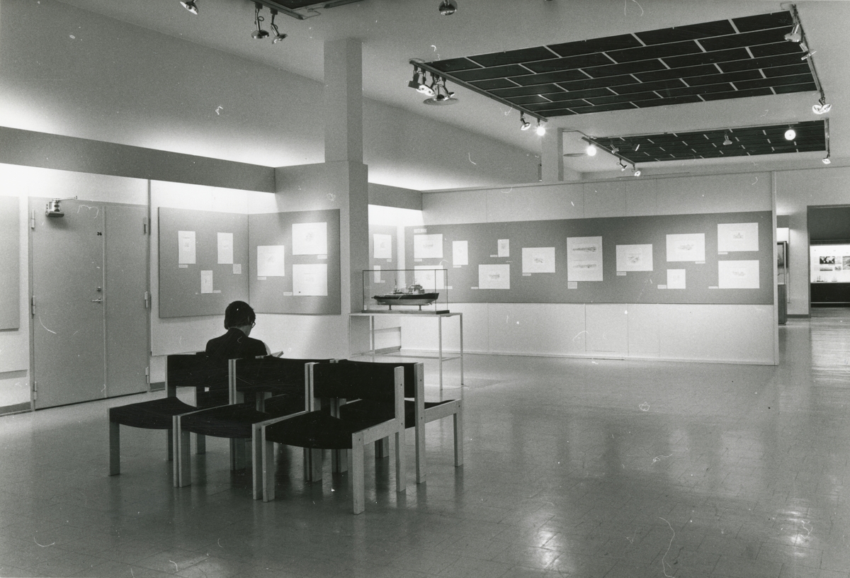 Utställningen "Lotsa, Leda, Loda". En serie teckningar kring Sjöfartsverkets verksamhet i Stockholm sommaren 1974 tecknade av Bertil Kumlien. Utställningsinteriör med sittplatser för besökare.