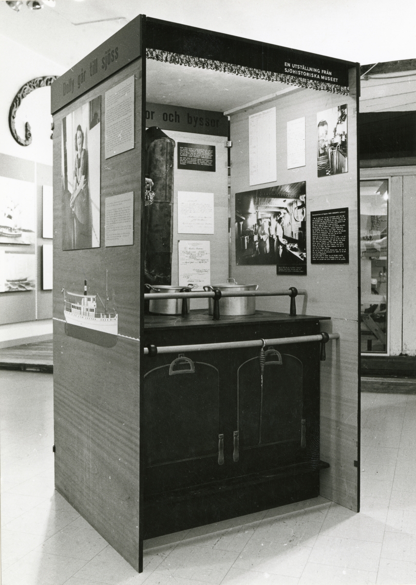 Titel: Utställningen "Restauratriser". En utställning i form av en kub med presentation från alla fyra sidor visandes matlagning och servering till sjöss.