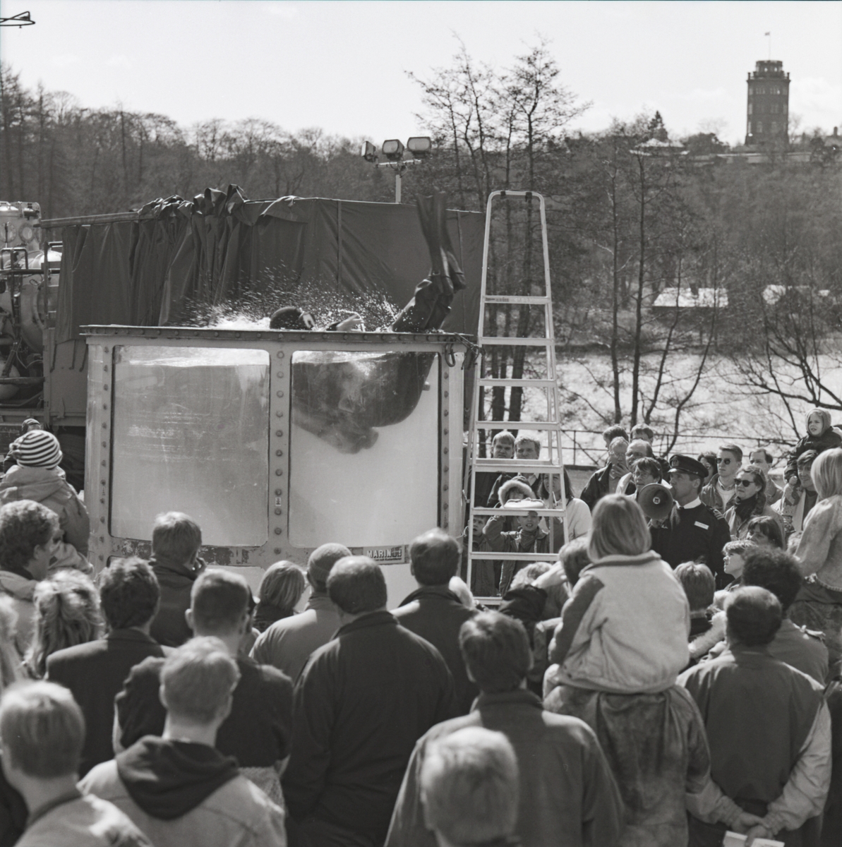 Aktivitet utanför Sjöhistoriska museet i samband med utställningen "Ubåtar, finns dom". Uppvisningsdyk av dykare.