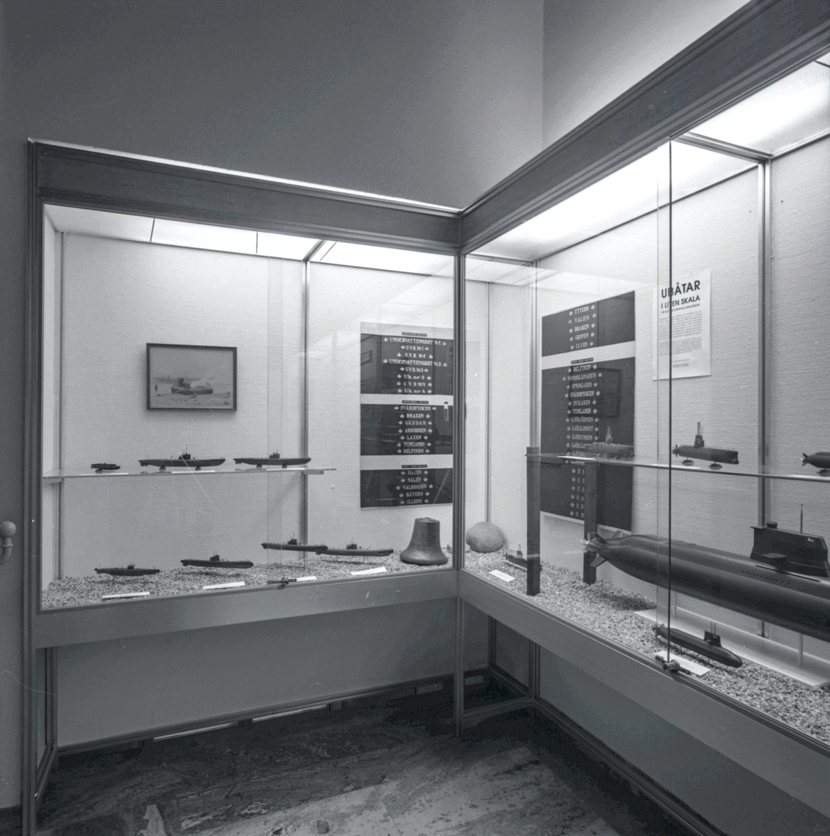Utställningen "En märkvärdig utställning". Utställning i trappmonter med ubåtsmodeller, mössmärken, märken och tecken. Många tillverkade av Sporrongs.
