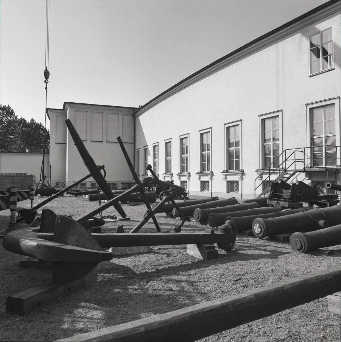Titel: Arbetet med uppförandet av kanonerna på Kanongården vid museets baksida. Tunga lyft med kranbil.