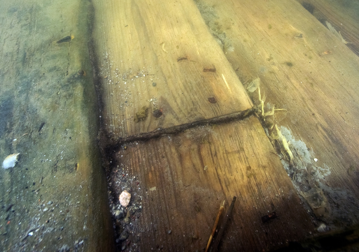Förstoring av Fo223318. Från vänster: Kölen, sambordet (med lask). Spikar och omböjda spikar kan ses i mitten av bilden