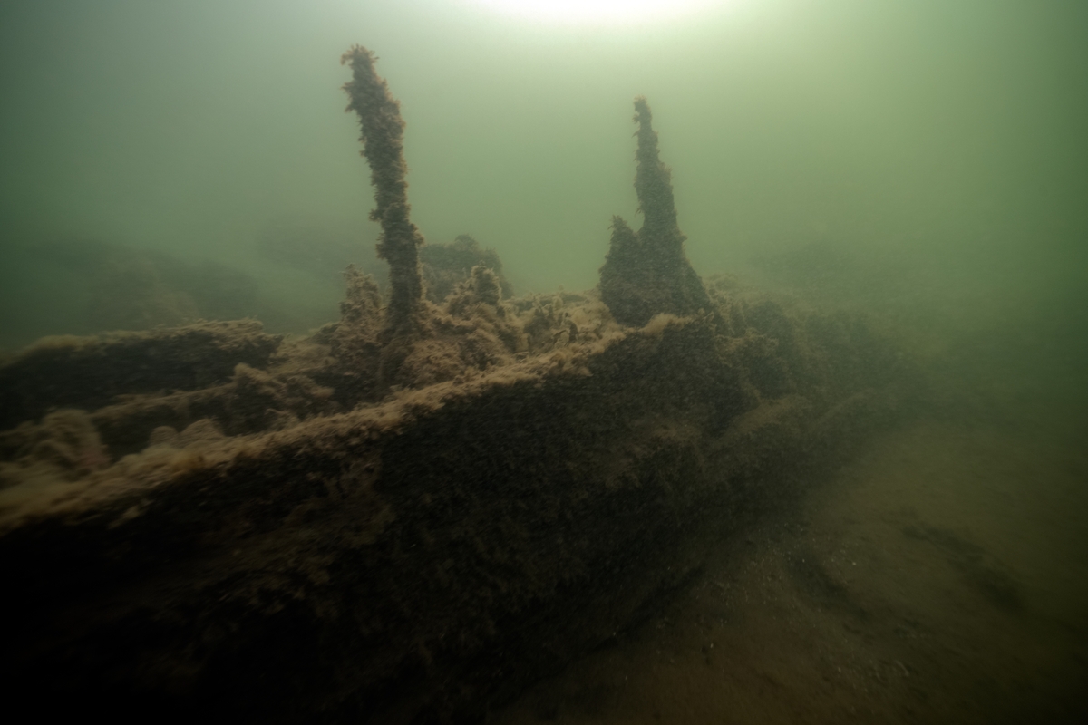 Babordssidan sedd utifrån mot aktern. Notera däcksbalkarna sittandes på sin ursprungliga plats på insidan till vänster. Fartygslämning L1978:4814 Fredrik Wilhelm.