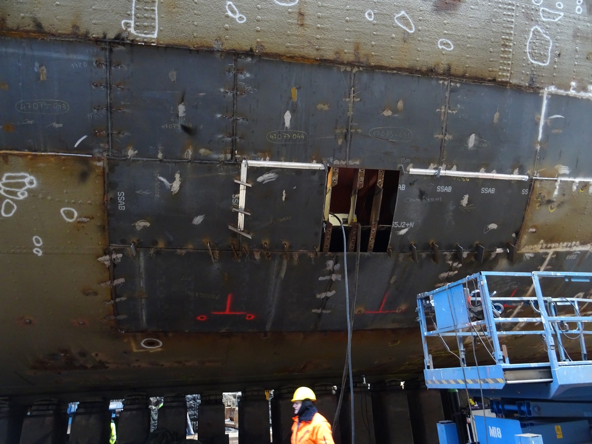 Isbrytaren SANKT ERIK på Stockholms Reparationsvarv. Ersättningsplåtar har svetsats fast i skrovet.