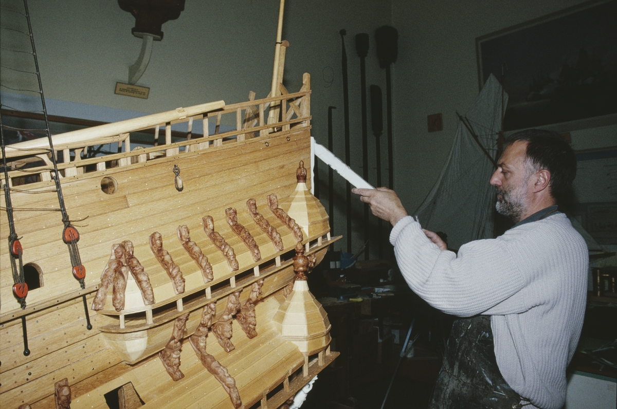 Ingvar Jörpeland i arbete med akterspegeln på vasamodellen i skala 1:10. Skulpturerna och övrig utsmyckning på modellen är skulpterade i cernitlera.