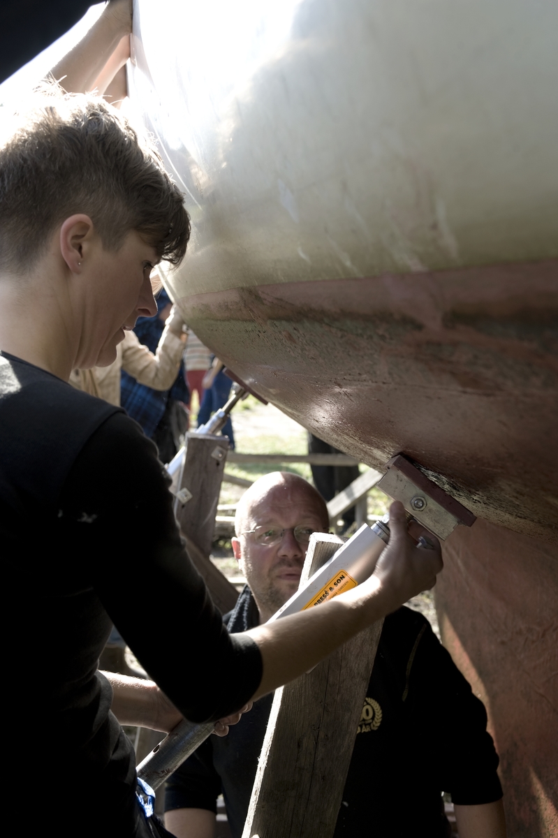 Båtupptagning på gammalt traditionellt vis, med handkraft, på Årstavikens SS vid Eriksdalsbadet 26 september 2009