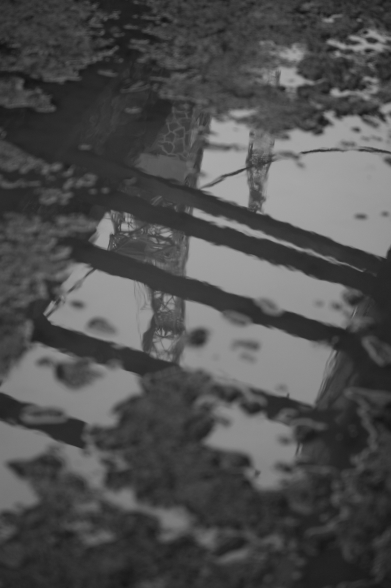 Reflektion av kran i vattenpöl på botten av Gustav V:s torrdocka, Beckholmen, Stockholm.