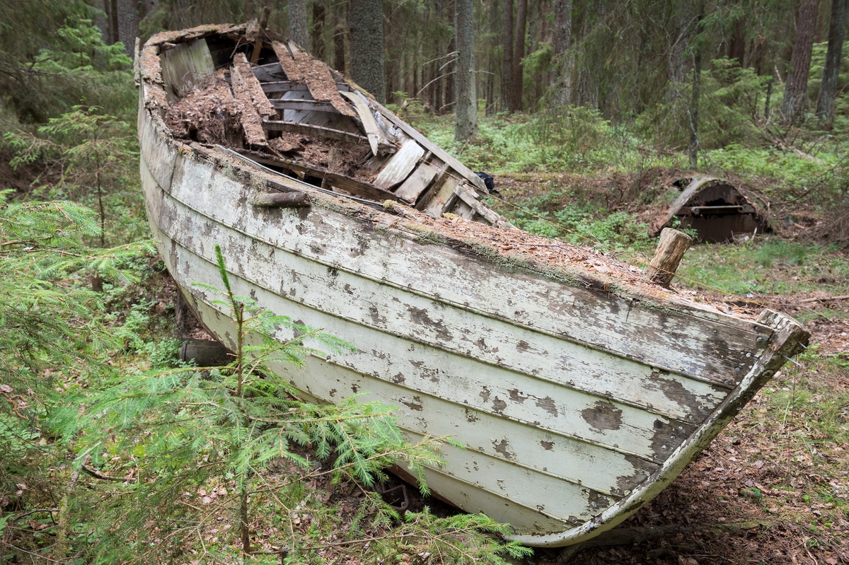 Titel: Förfallet vrak av baltisk flyktbåt i skogen på Järflotta. År 1943 användes båten av en grupp på fem för att fly från det Nargö och det ockuperade Estland till Sverige.