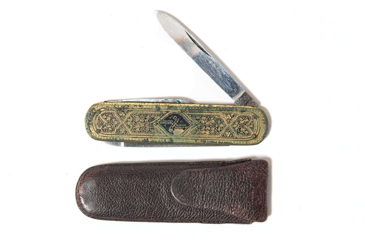 Fickkniv med tillhörande fodral i skinn. Medtogs troligen på flykt från Estland till Sverige i båten "Kala".