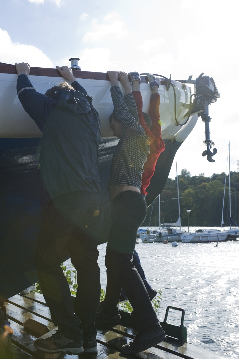 Titel: Båtupptagning på gammalt traditionellt vis, med handkraft, på Årstavikens SS vid Eriksdalsbadet 26 september 2009
