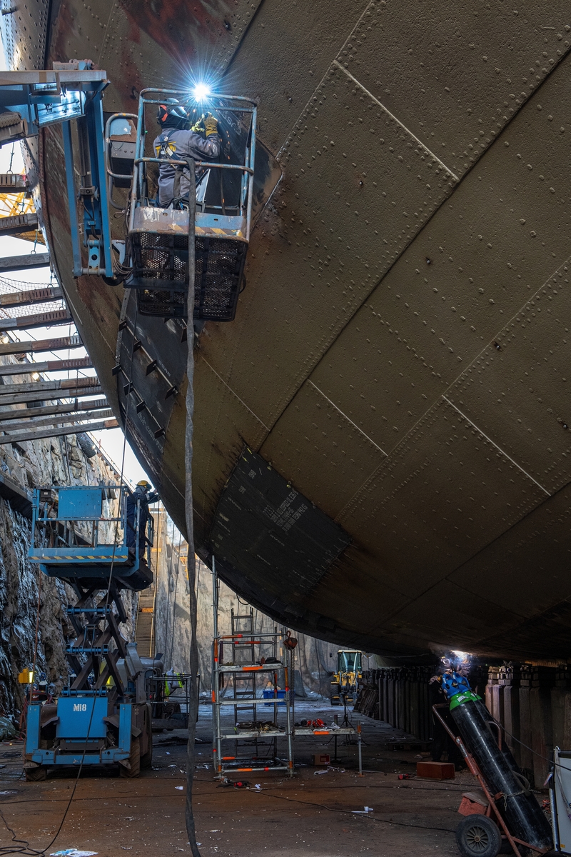 Isbrytaren SANKT ERIK på Stockholms Reparationsvarv, Beckholmen. Svetsarbeten på skrovet.