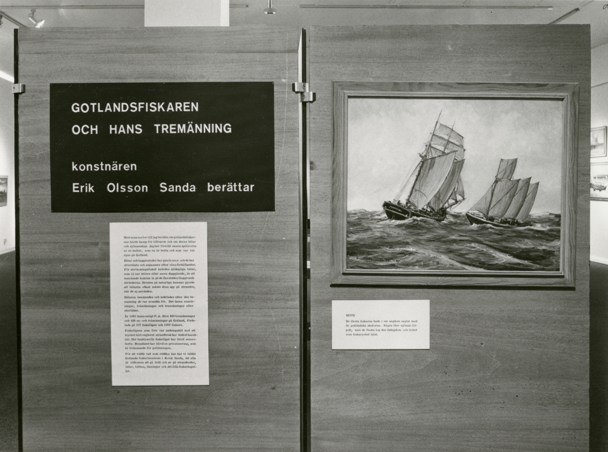 "Gotlandsfiskaren och hans tremänning konstnären Erik Olsson Sanda berättar." Inledningsskärmen med utställningstext och ett konstverk.