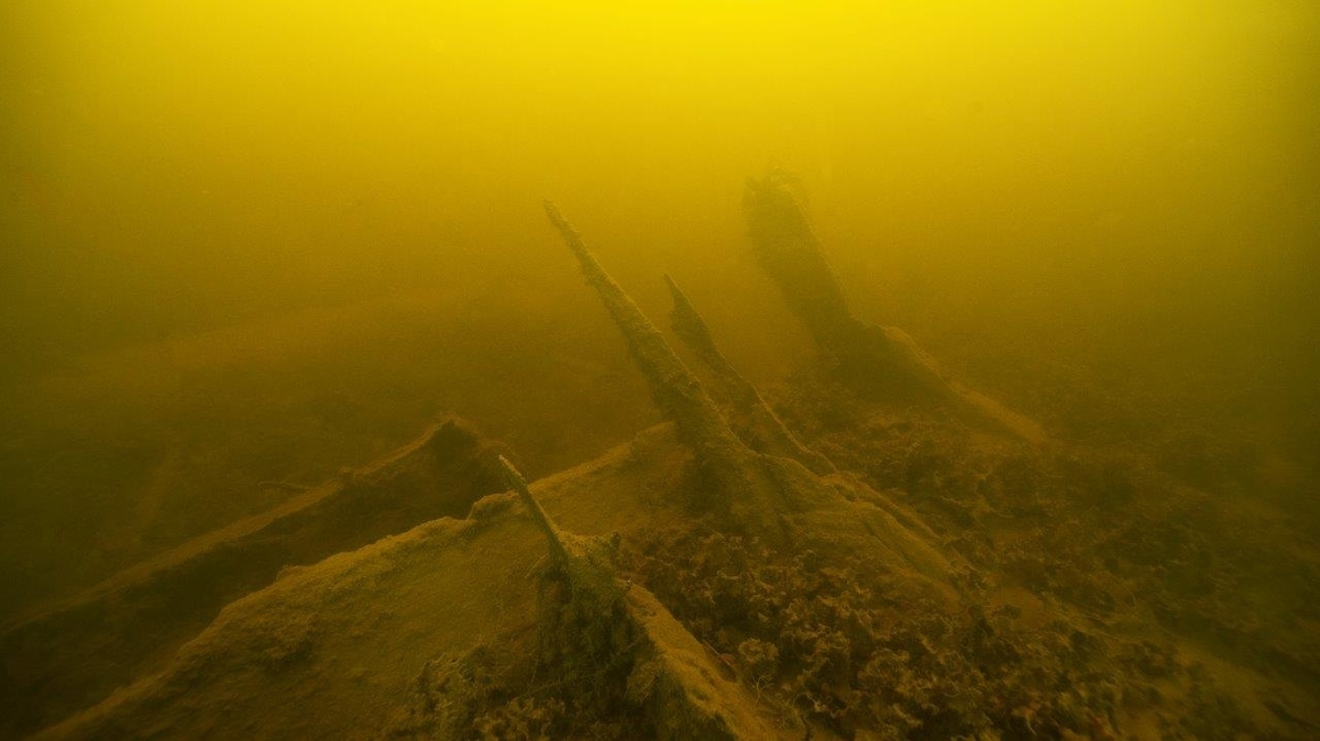 Bilden visar en fartygslämning. Man ser eroderade bottenstockar. Lämningsnummer L2020:1811.