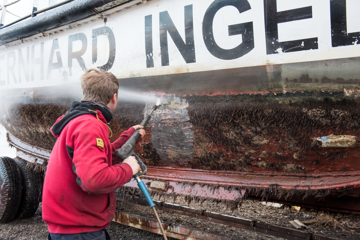 Sjöräddningskryssaren Bernhard Ingelsson bygg 1945. Blästras och målas på Boghammar Marin AB. Lidingö.