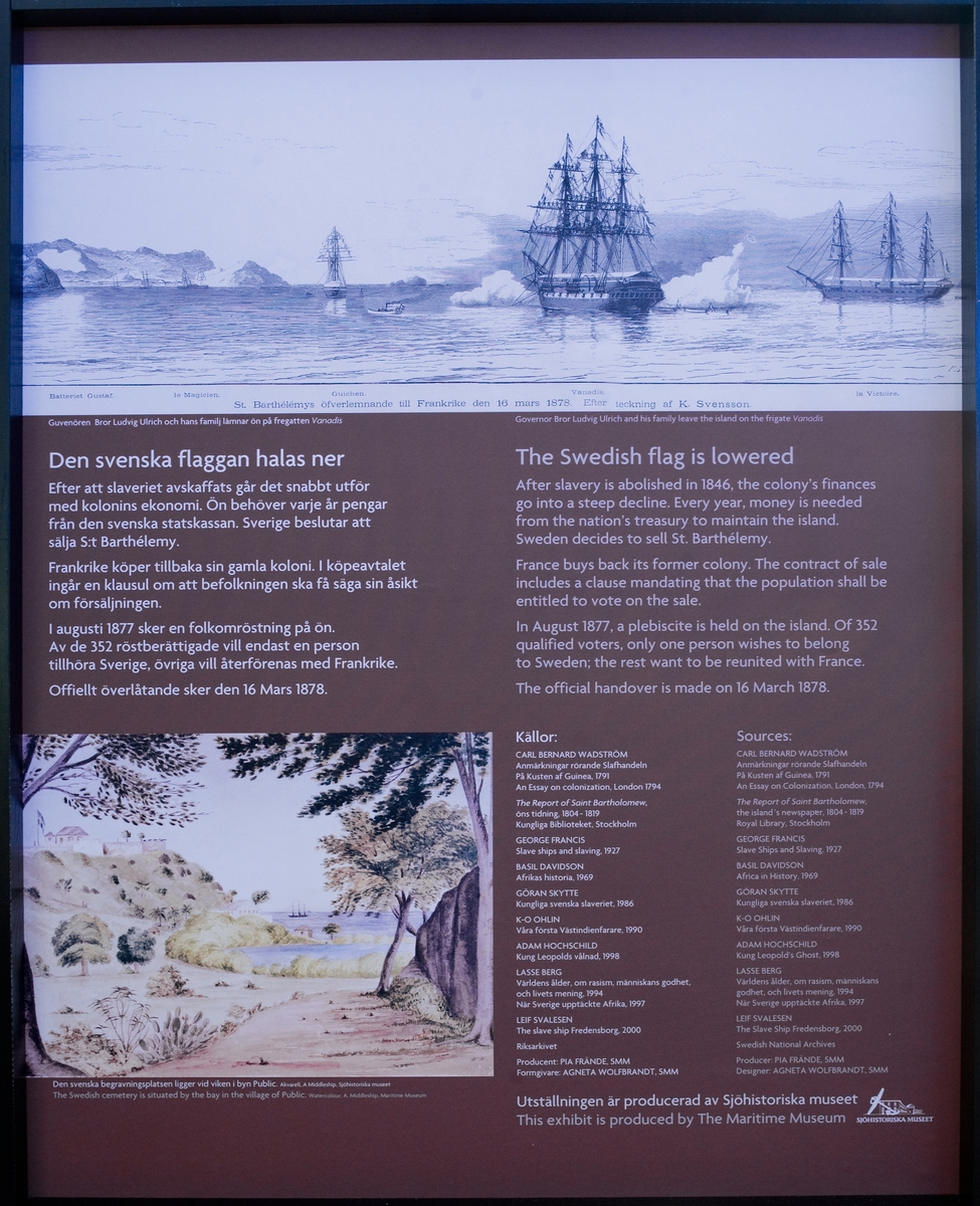 Vandringsutställningen "En dunkel historia" om den transatlantiska slavhandeln. Skylt med utställningstext.