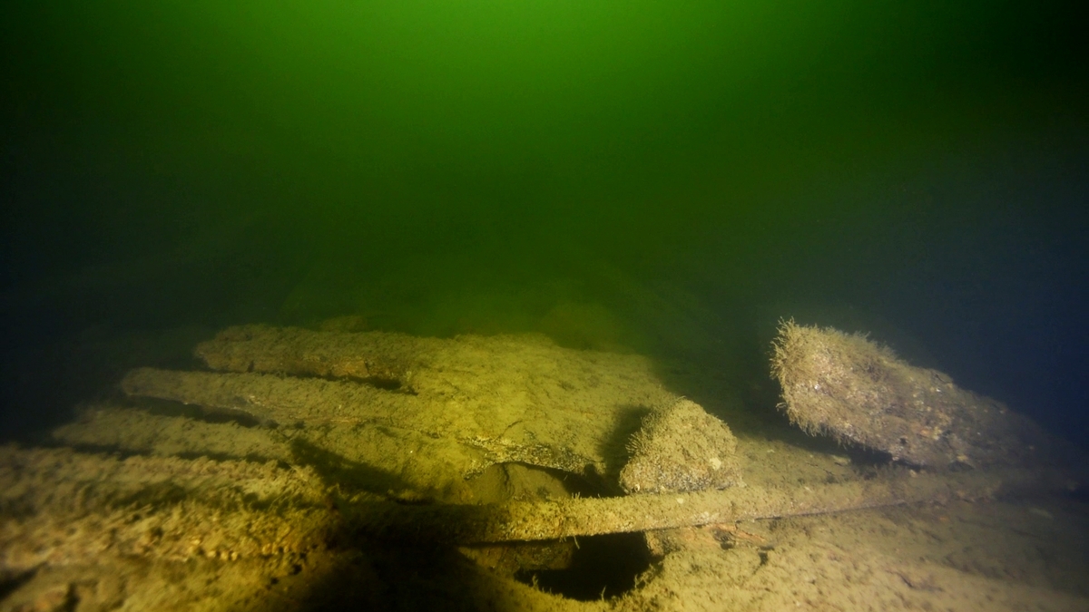 Ankarklyset ligger välbevarat på botten nedanför fören på Apollo i ett sjok av skrovet.