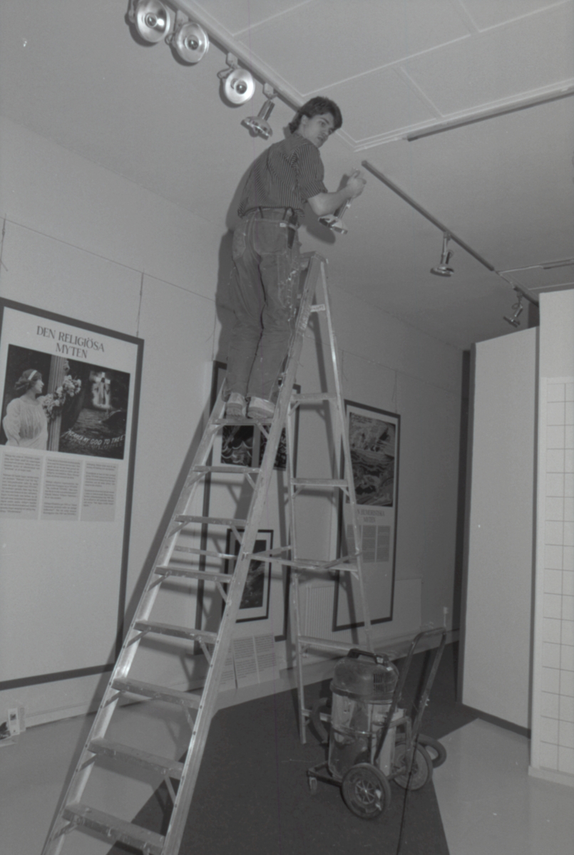 Utställningen "Titanics skatter". Sjöhistoriska museets personal under arbetet med utställningen. Peter Dans arbetar med belyningen från stegen.