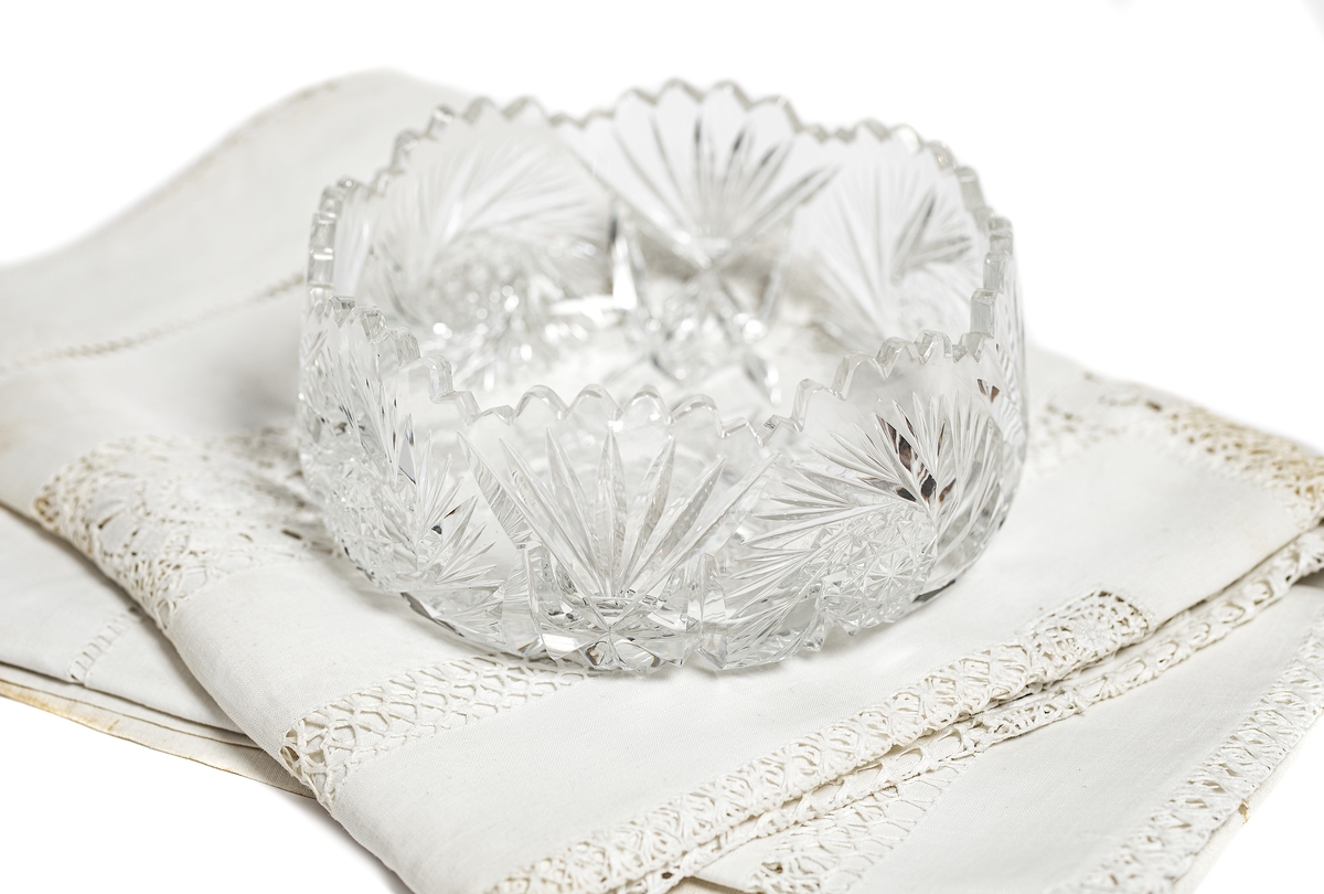 En kristallskål som använts som dopskål, samt en handknypplad dopduk. Både skålen och duken medtogs på flykt från Lettland till Sverige år 1944.