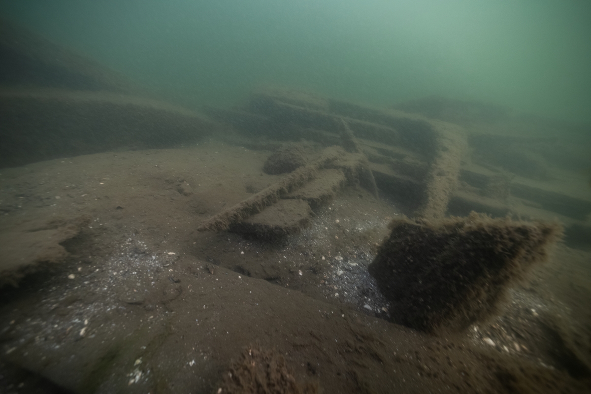 Delar av det bevarade däcket tittar fram under bogbandet ,som skymtar till vänster i bild. Fartygslämning L1978:4814 Fredrik Wilhelm.