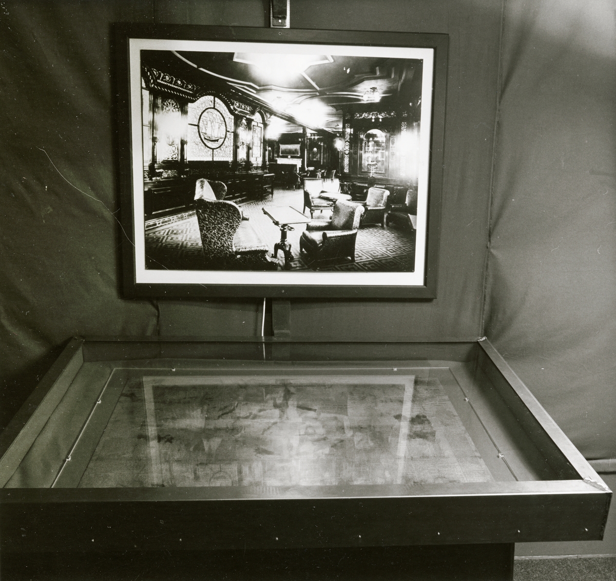 Utställningen "Titanics skatter". Monter i utställningen samt ett fotografi som visar en miljö från Titanic.