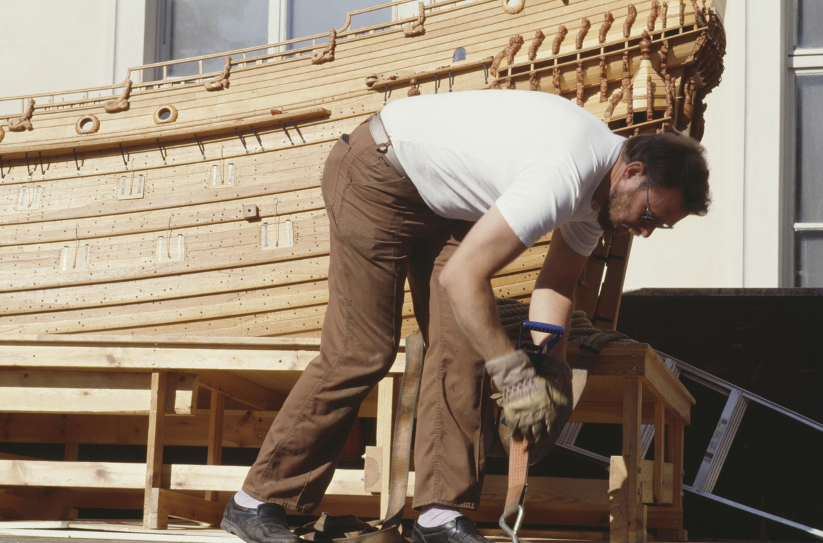 Vasamodellen i skala 1:10 flyttas från Sjöhistoriska museet till Vasamuseet sommaren 1990.