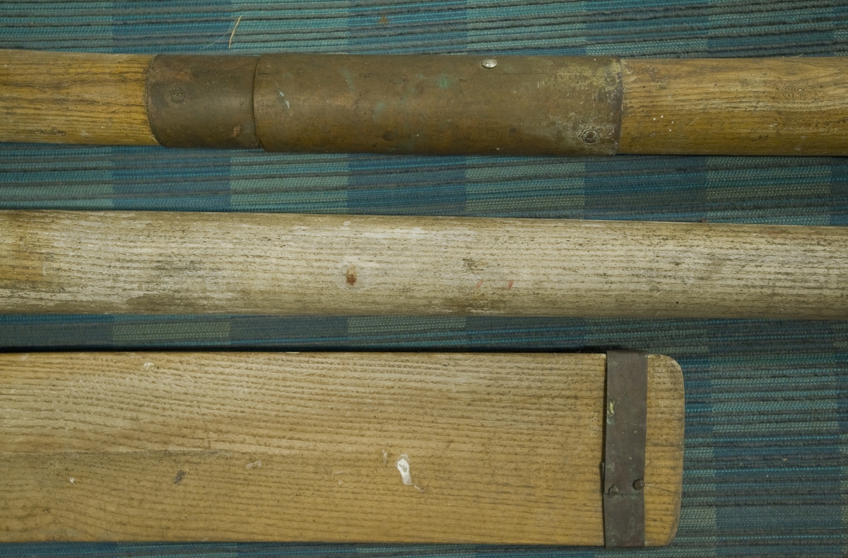 Petterssonbåten WIKING X i Båthall II. Delbara åror i furu med skoningar i mässingslegering, 2x 136 cm långa delar. 5 cm i diameter, 10,5 cm breda årblad.
