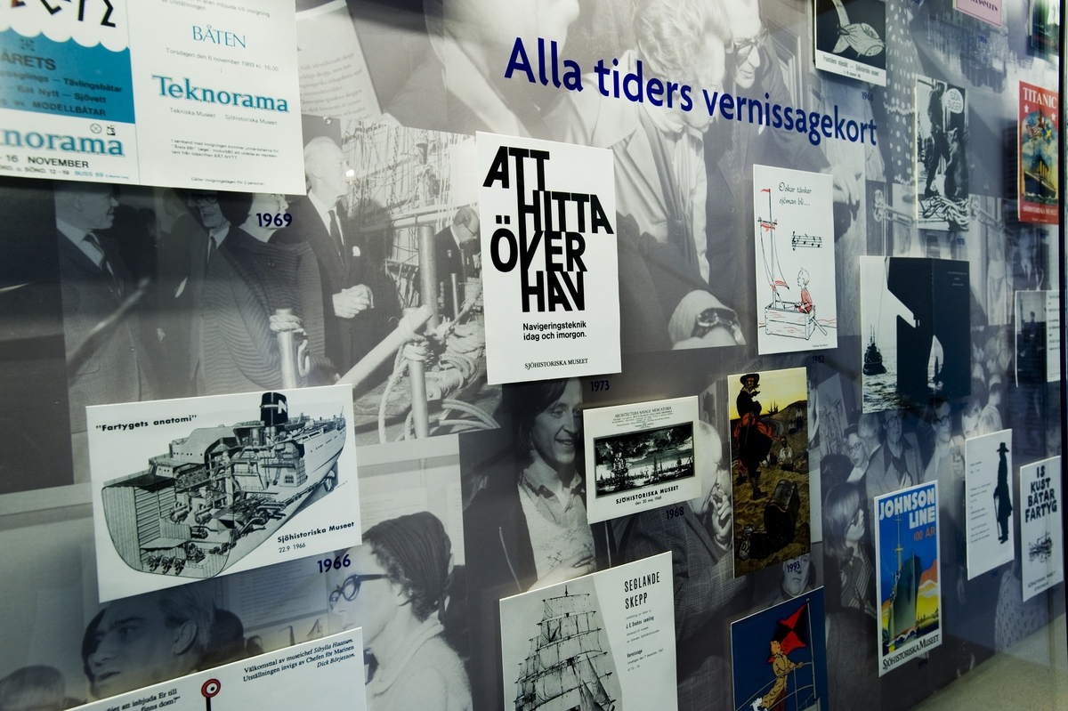 Utställning i trappmonter på Sjöhistoriska museet. Vernissagekort genom tiderna visas.