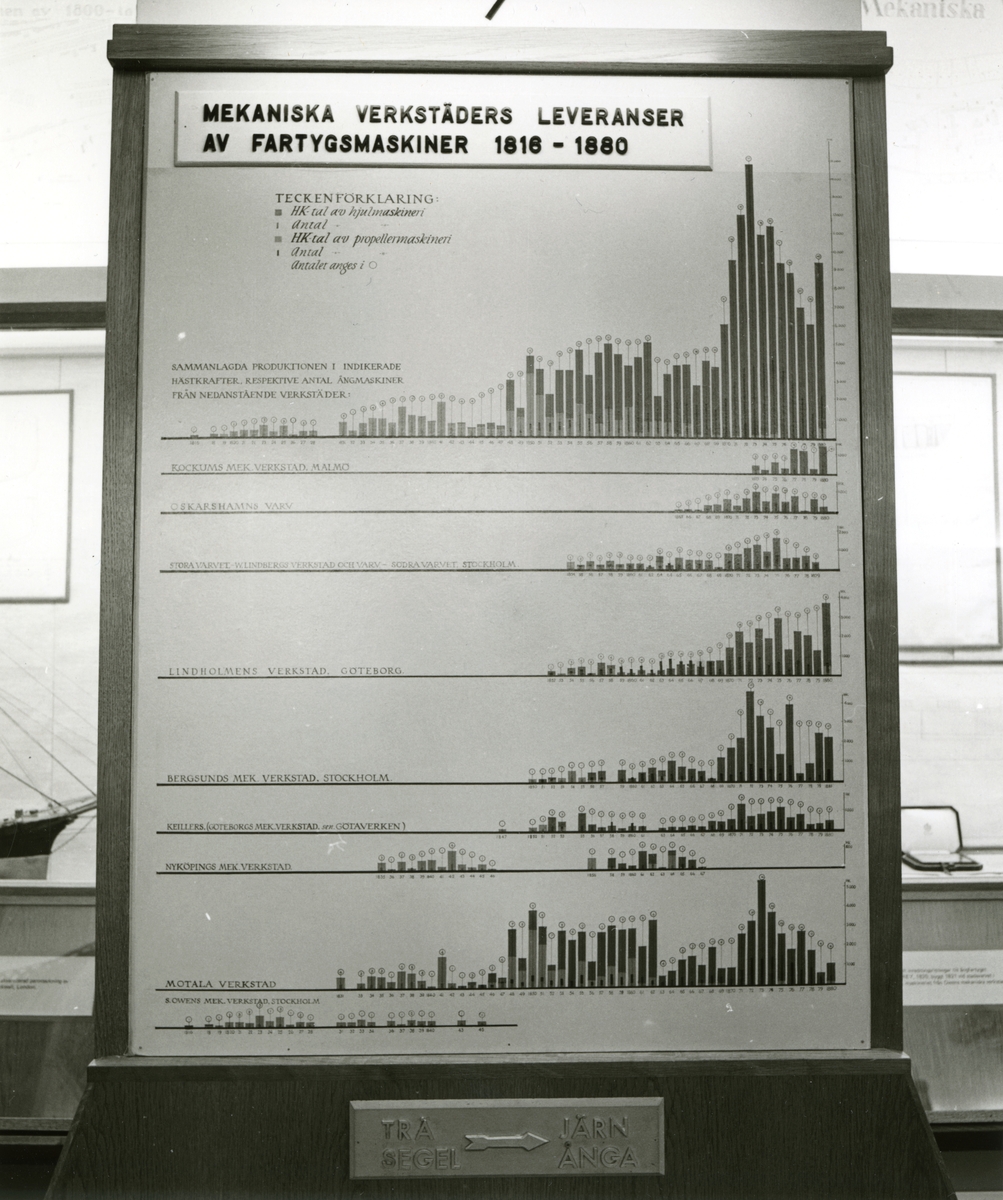 Sjöhistoriska museets permanenta utställning fotograferad 1987. Skylt visande Mekaniska verkstäders leveranser av fartygsmaskiner 18161880.