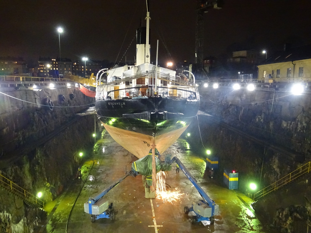 Isbrytaren SANKT ERIK i kvällsbelysning på Stockholms Reparationsvarv.