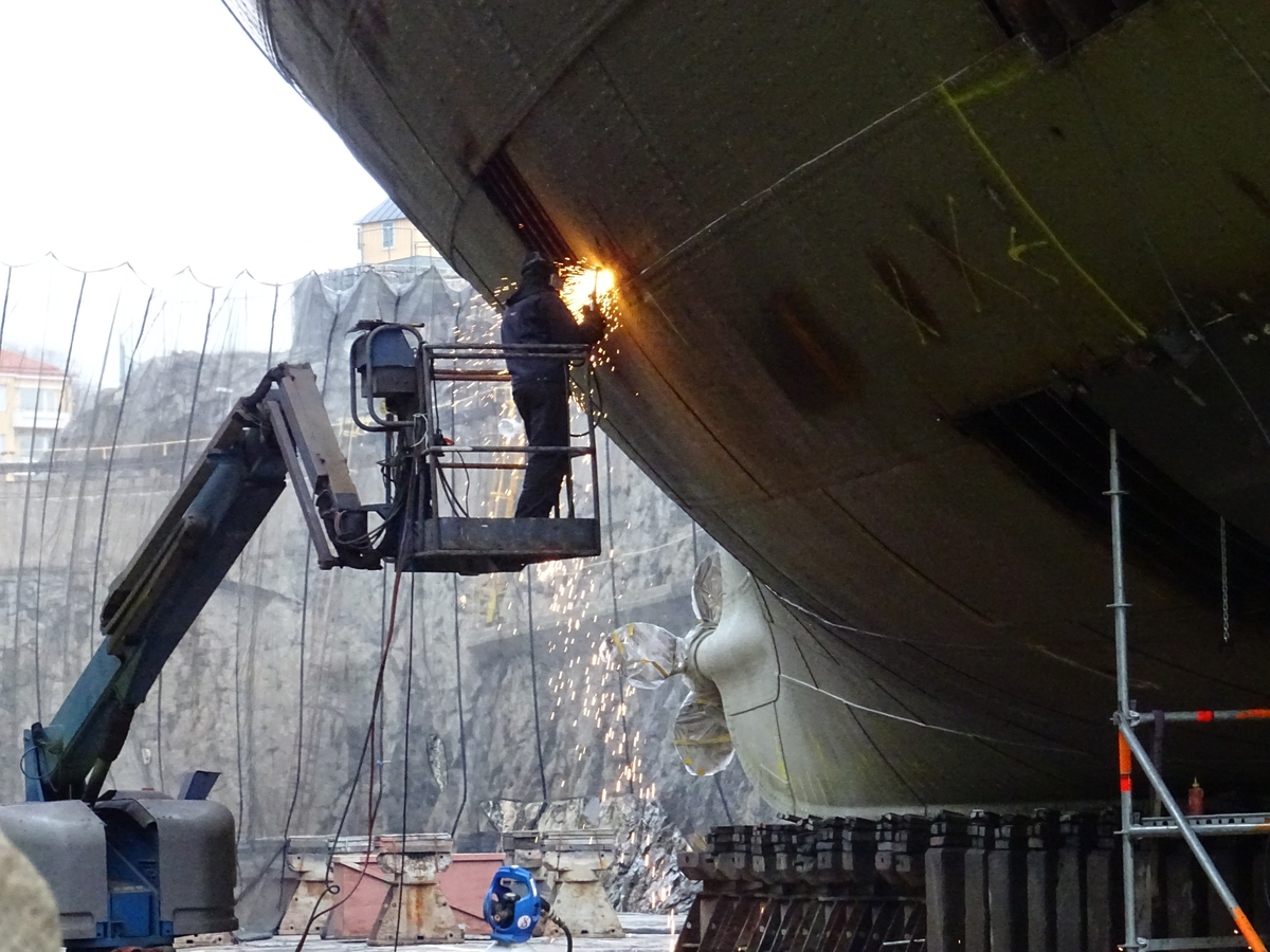 Isbrytaren SANKT ERIK på Stockholms Reparationsvarv. Rostiga plåtar avlägsnas från skrovet med skärbrännare.