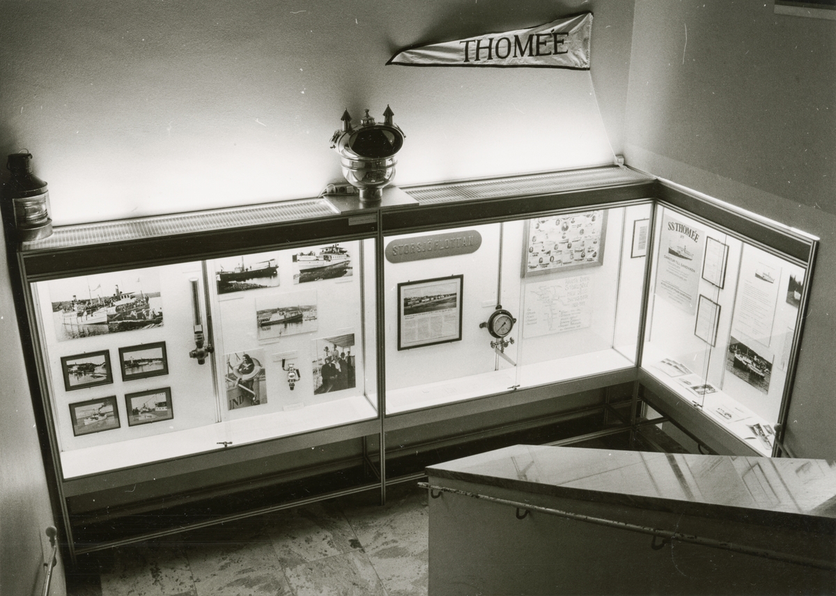 Utställningen "Storsjöflottan". Överblick av trappmonter med fotografier, föremål och texter kopplade till Storsjöflottan.