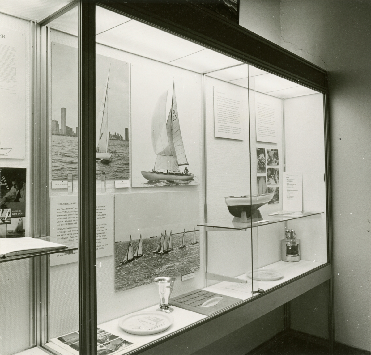 Utställningen "Tumlaren 50 år". Del av utställning i trappmonter med fartygsmodell, pokal m.m.