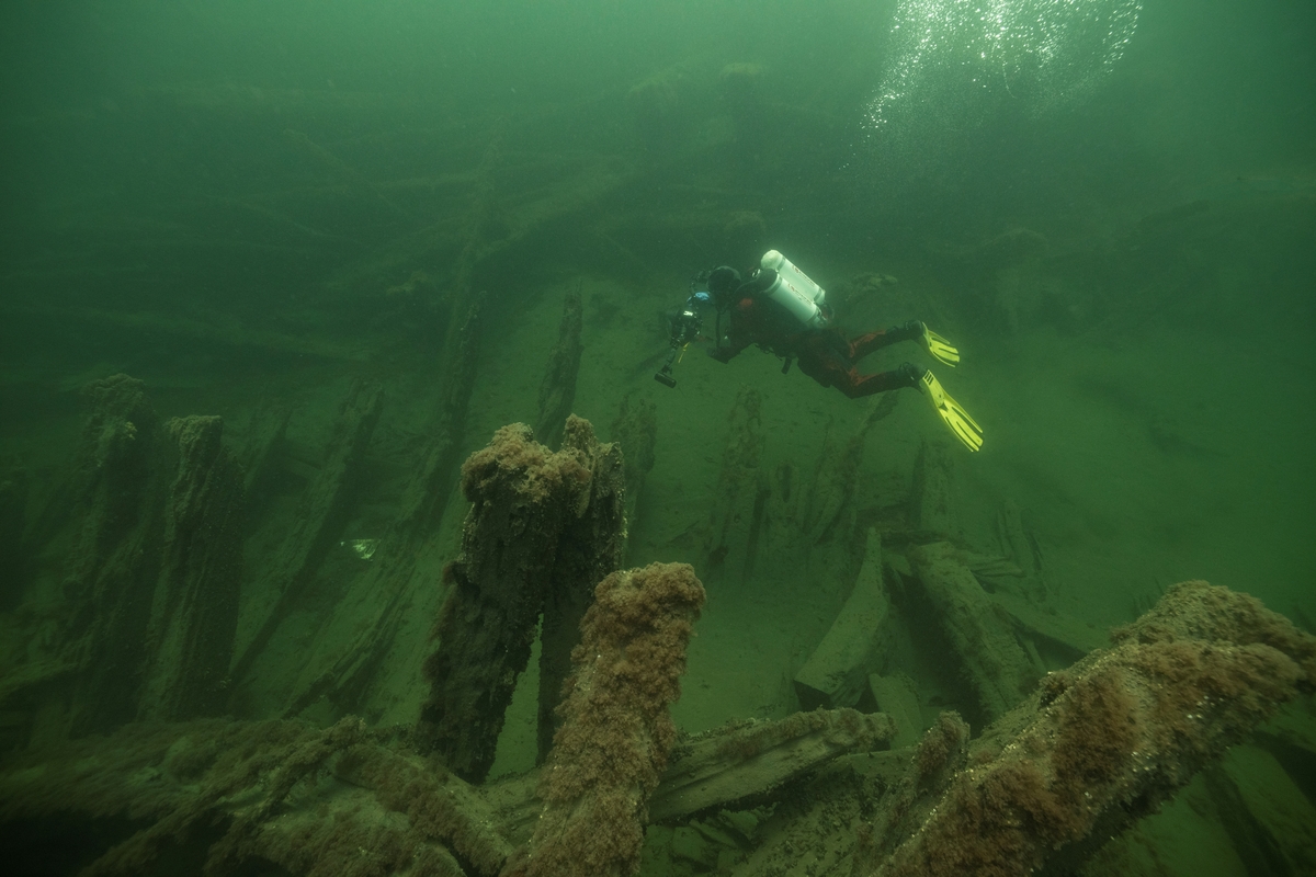 Wasas spant på babordssidan syns i förgrunden och längre bort i bilden syns Enigheten. Notera Enighetens